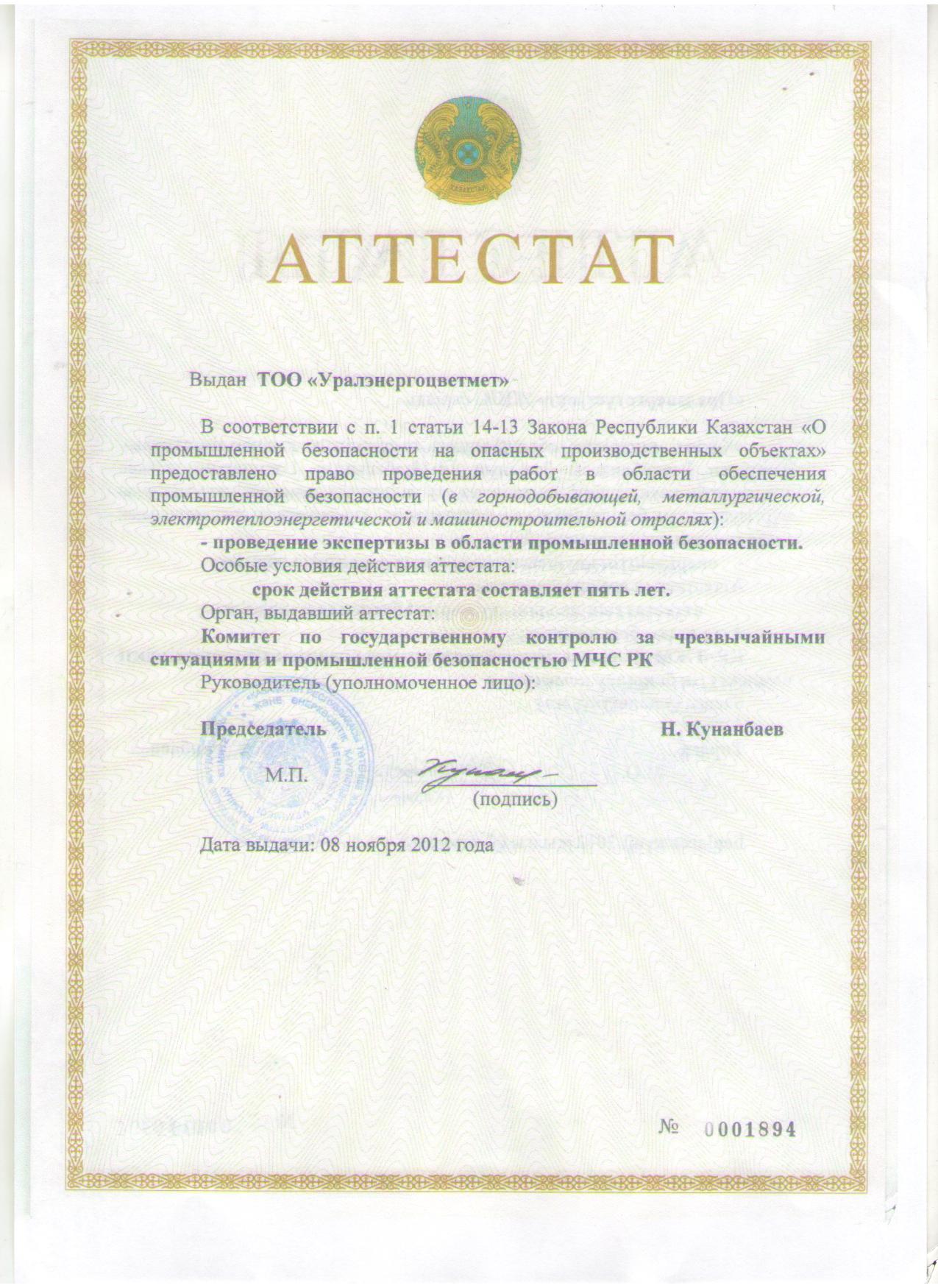 На основании выданного 08.11.2012 г. аттестата ТОО «Уралэнергоцветмет» также предоставлено право на проведение экспертизы в области промышленной безопасности в горнодобывающей, металлургической, электротеплоэнергетической и машиностроительной отраслях.